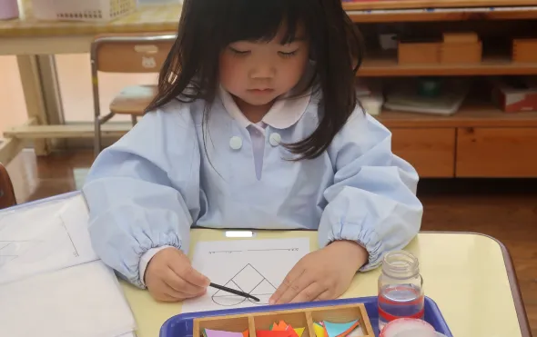 まずはイエス様とマリア様に朝のご挨拶。出席カードのシール張り、スモックや体操服へ着替え、荷物の整理を自分でします。その後モンテッソーリのお仕事をして過ごします。