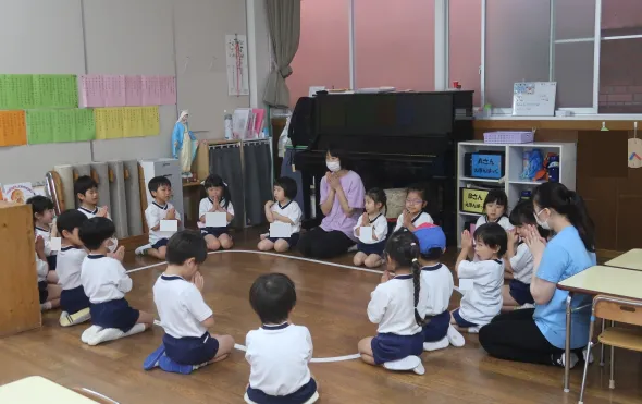 毎週火曜日、明光学園のシスターアイダ先生が、子どもたちに英語のLessonをしてくださいます。年少児~年長児まで、それぞれの学年のレベルに応じて、楽しいLessonが繰り広げられています。