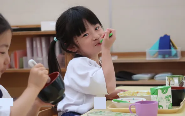 全園児、園内で調理した給食を食べます。年少児以上は月に1回、お弁当の日を設け、愛情たっぷりのお弁当をみんなで食べます。