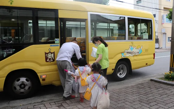 お帰りの会をしたあと、先生とお友達に挨拶し、14時に最初のバスコース出発、